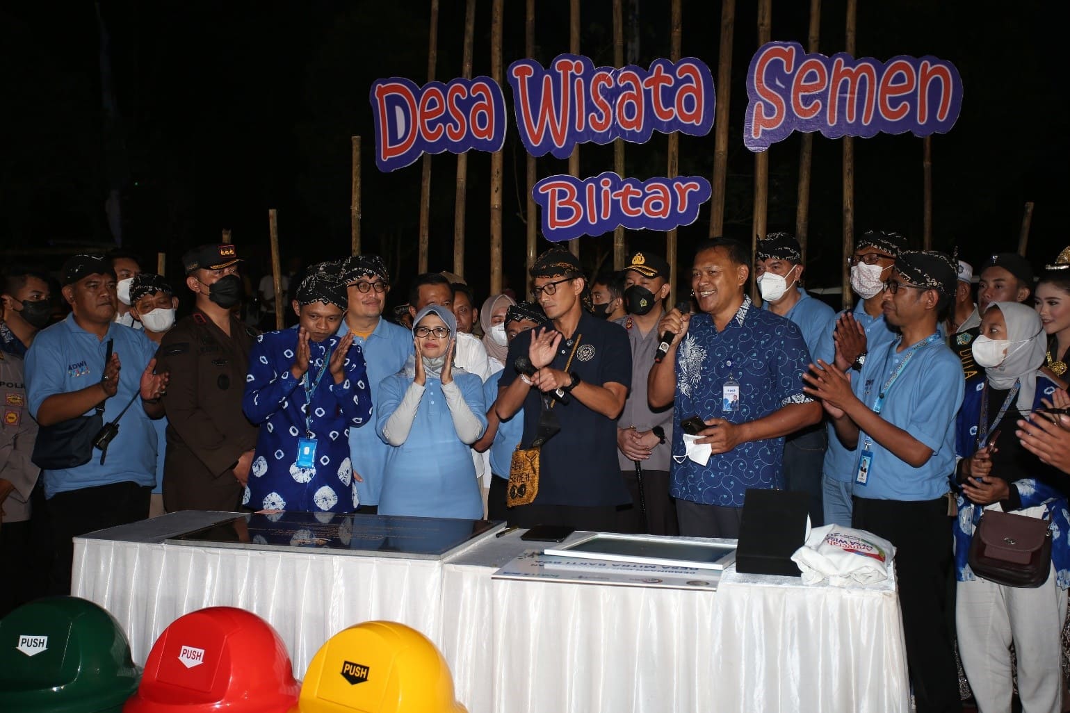 Mengulik Kawasan Desa Wisata Semen di Blitar – Desa Mitra Bakti BCA - Menparekraf Sandiaga Salahuddin Uno (tengah) didampingi Kepala Kantor Cabang BCA Blitar Agus Setyo Budiman (kedua dari kanan - Batik Biru) saat visitasi dalam rangka ADWI 2022 ke Desa Wisata Semen di Kecamatan Gandusari, Blitar, Jawa Timur, Rabu (29/6). 10 Desa Wisata Mitra Bakti BCA tersebut merupakan finalis dari ajang Anugerah Desa Wisata Indonesia (ADWI) 2022 yang diselenggarakan oleh Kementerian Pariwisata dan Ekonomi Kreatif dimana BCA berkomitmen untuk memberikan pembinaan dan pendampingan untuk pengembangan desa yang menjadi Mitra Bakti BCA.