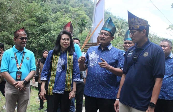 Menteri Pariwisata dan Ekonomi Kreatif Sandiaga Uno, Direktur BCA Antonius Widodo, EVP Corporate Social Responsibility BCA Inge Setiawati, VP Corporate Social Responsibility BCA Ira Bachtar, Kepala Kantor Cabang Utama BCA Padang Robert Siahaan melakukan kunjungan ke Desa Wisata Nagari Silokek di Sumatera Barat, pada Rabu (06/07). Desa Wisata Silokek merupakan Desa Wisata Binaan Bakti BCA sekaligus Desa Mitra Bakti BCA yang turut menjadi bagian dari program ADWI 2022.