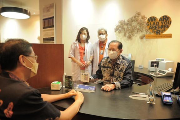 Direktur BCA Santoso menyapa salah satu nasabah pada momen Hari Pelanggan Nasional 2022 di KCU BCA Thamrin, Jakarta pada Jumat (02/09).
