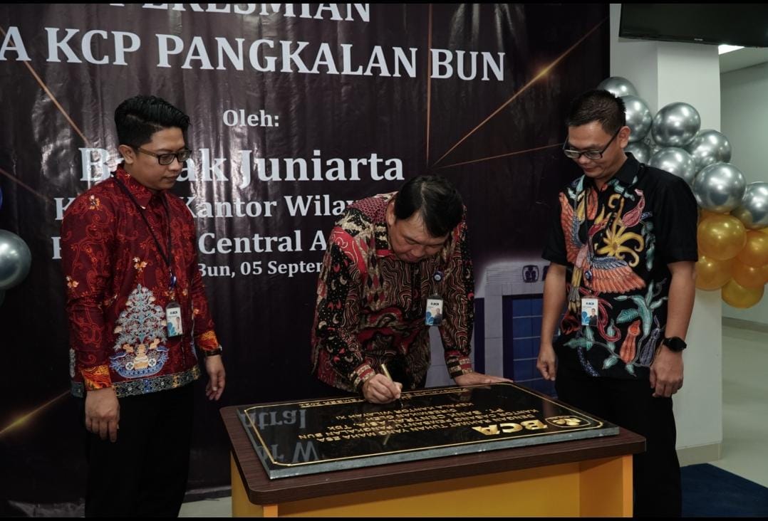 BCA Resmikan KCP Pangkalan Bun – Seremoni peresmian KCP BCA Pangkalan Bun yang dihadiri oleh Kakanwil XI BCA Juniarta (tengah), Kepala BCA KCP Sampit Erwin Prakosa (kiri) dan Kepala BCA KCU Palangkaraya Dicky Junaidi (kanan) pada Senin (05/09). BCA merelokasi Kantor Cabang Pembantu (KCP) Pangkalan Bun untuk memberikan kemudahan dan kenyamanan bagi nasabah dalam bertransaksi perbankan.