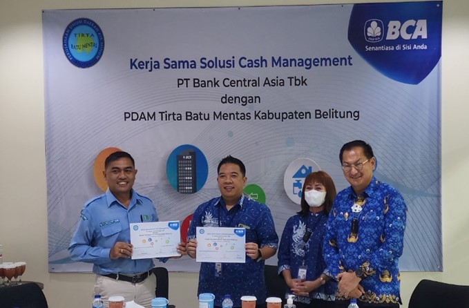 Belitung, 17 Oktober 2022 – Komitmen PT Bank Central Asia Tbk (BCA) dalam menghadirkan service exellence bagi seluruh nasabah senantiasa diwujudkan melalui berbagai inisiatif. Setelah sukses menghadirkan kerja sama solusi pembayaran dengan Perusahaan Umum Daerah Air Minum (PERUMDAM) di berbagai wilayah di Indonesia, kali ini BCA menghadirkan solusi Cash Management bagi PERUMDAM Tirta Batu Mentas Kabupaten Belitung. Dengan kerja sama ini, nantinya masyarakat Kabupaten Belitung dapat membayar tagihan air melalui ATM BCA. Ke depan, pembayaran juga akan dikembangkan melalui e-channel BCA lainnya.