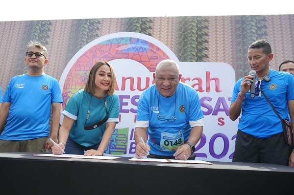 Komitmen BCA Perkuat Dukungan Bagi Desa Wisata Indonesia - EVP Corporate Communication & Social Responsibility, Hera F. Haryn (tengah) bersama Deputi Bidang Pengembangan Destinasi dan Infrastruktur Kemenparekraf, Vinsensius Jemadu (kedua kiri) menandatangani Perjanjian Kerja Sama Anugerah Desa Wisata Indonesia (ADWI) 2022 disaksikan oleh Menteri Pariwisata dan Ekonomi Kreatif, Sandiaga Salahuddin (kanan) serta Direktur Tata Kelola Destinasi dan Pariwisata Berkelanjutan Kemenparekraf, Indra Ni Tua (kiri) dalam acara Pameran ADWI 2022 di Jakarta, Minggu (30/10).