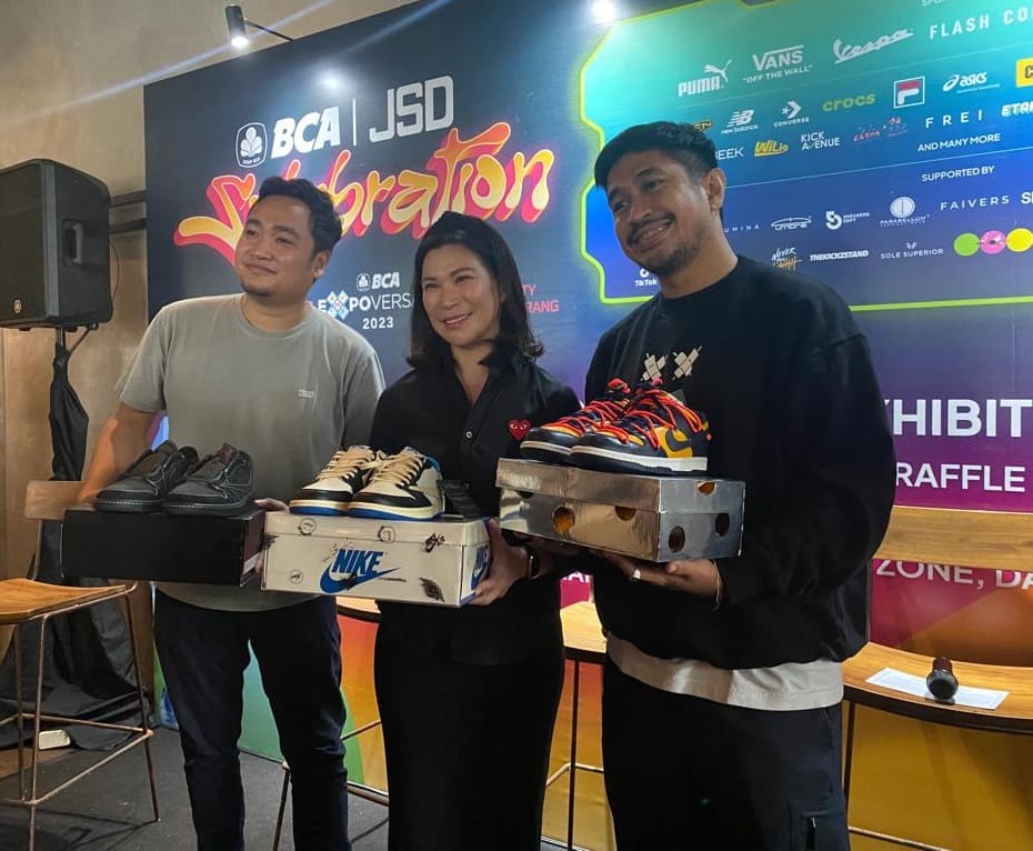 BCA Dukung Industri Sneaker Bertumbuh - BCA mengukuhkan komitmen mendukung Jakarta Sneaker Day mencapai visi mereka "Sneaker for All". Dalam acara Konferensi Pers Jakarta Sneaker Day X BCA (9/2). Foto menunjukan Co-Founder Jakarta Sneaker Day Andre Noelfry (Kiri),Vice President BCA Ana Rahmat (Tengah) serta Event Director Jakarta Sneaker Day Trias Jaka Arfa (Kanan) membahas aneka program menarik yang bisa di nikmati pada gelaran Jakarta Sneaker Day dalam rangkaian kegiatan BCA Expoversary 2023 di akhir Februari mendatang yang diharapkan dapat mengundang para sneakerheads untuk dapat menemukan sneakers impiannya.