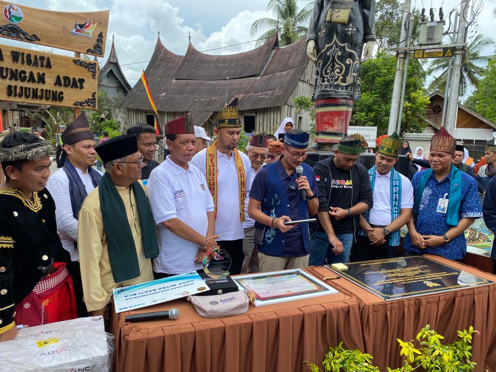Desa Binaan Bakti BCA Perkampungan Adat Nagari Sijunjung Jadi Nominasi Desa Wisata Terbaik di Indonesia - Menteri Pariwisata dan Ekonomi Kreatif Sandiaga Uno (empat dari kanan) memberikan sambutan saat melakukan kunjungan ke Desa Binaan Bakti BCA Perkampungan Adat Nagari Sijunjung, yang terpilih menjadi salah satu dari 75 nominasi Desa Wisata Terbaik di Indonesia versi Anugerah Desa Wisata Indonesia (ADWI) 2023. Kegiatan juga dihadiri Kepala BCA KCU Padang Robert Siahaan (paling kanan), Wakil Gubernur Sumatera Barat Audy Joinaldy (tiga dari kanan), Bupati Sijunjung Benny Dwifa Yuswir (lima dari kanan), dan Wakil Bupati Sijunjung H. Iraddatillah (dua dari kanan). Berbekal histori dan pengalaman membina desa wisata di Indonesia, BCA meyakini terpilihnya Perkampungan Adat Nagari Sijunjung dapat menjadi penggerak ekonomi masyarakat di Nagari Sijunjung. Berbekal histori dan pengalaman membina desa wisata kami berharap Perkampungan Adat Sijunjung dapat menjadi salah satu desa wisata terbaik di Indonesia.