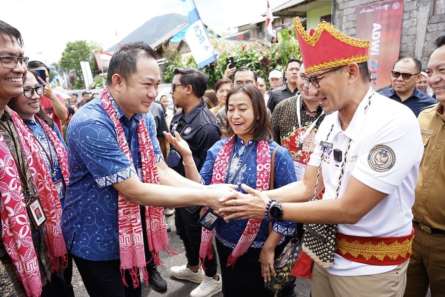 Visitasi Menparekraf RI ke Desa Wisata Kakaskasen Dua - Kepala KCU BCA Manado Liau Jung Nyap (ketiga dari kiri) dan VP CSR BCA Nona Faletta Aryuni Sumanang (ketiga dari kanan) menyambut kehadiran Menteri Pariwisata dan Ekonomi Kreatif RI Sandiaga Uno (kedua dari kanan). Setelah Tim Dewan Juri ADWI 2023 melakukan penjurian Desa Wisata Kakaskasen Dua secara langsung pada tanggal 7 Agustus 2023, sehari setelahnya Menparekraf RI turut melakukan visitasi ke Desa Wisata Kakaskasen Dua.
