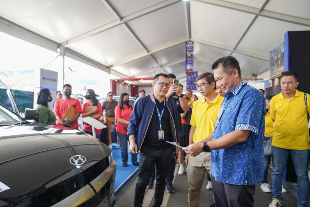 BCA Expo 2023 Bandung, Ajang Masyarakat Bandung Dapatkan Kendaraan Idaman - Kepala Kantor Wilayah I BCA Weminto Suryadi (kanan) bersama Direktur PT Bela Parahiyangan Investindo Ryan Brasali (tengah) dan, Deputi Direktur BCA Finance Steven Lo (kiri) melihat salah satu mobil listrik terbaru keluaran Hyundai yang dipamerkan di BCA Expo 2023 Bandung pada Sabtu (16/09). Diselenggarakan dari tanggal 16-17 September 2023 di Jalan Bujangga Manik, Kota Baru Parahyangan, BCA Expo 2023 Bandung menawarkan program suku bunga spesial KKB BCA bagi nasabah yang ingin memiliki kendaraan idaman 2,6% flat p.a tenor 3 tahun dan DP 0%.