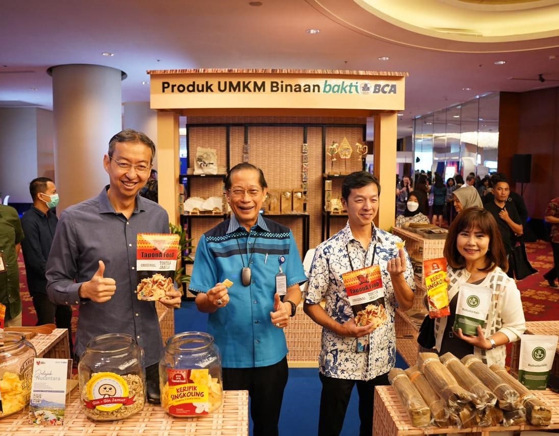 Produk UMKM Binaan Bakti BCA di Gelaran IKF 2023 - Presiden Direktur BCA Jahja Setiaatmadja (kedua dari kiri) didampingi oleh Wakil Presiden Direktur BCA Hendra Lembong (kiri), Wakil Presiden Direktur BCA Armand Hartono (kedua dari kanan), dan Direktur BCA Lianawaty Suwono (kanan) saat mengunjungi booth Produk UMKM Desa Binaan Bakti BCA di gelaran Indonesia Knowledge Forum XII 2023 pada Selasa (10/10). Kehadiran booth UMKM Desa Binaan merupakan salah satu upaya nyata BCA melalui Bakti BCA untuk memajukan bisnis UMKM agar dapat berkembang dan membantu menstimulasi pertumbuhan perekonomian Indonesia.