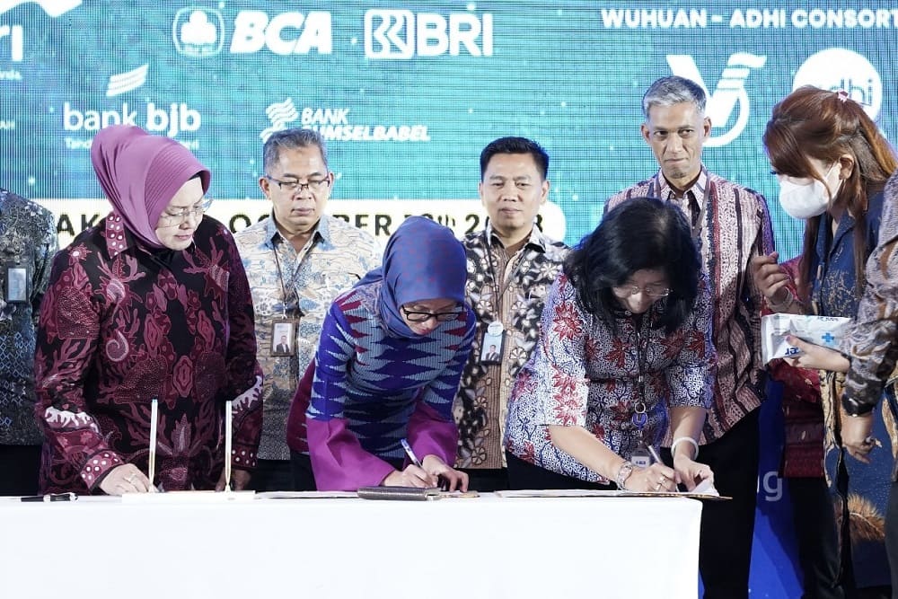 BCA Kucurkan Dana Rp1 Triliun untuk Proyek Pembangunan Pabrik Pupuk Pusri - Vice President Grup Corporate Banking BCA Yayi Mustika Pudyanti (tengah depan), Kepala Kantor Cabang Korporasi BCA Dhejani Surjadi (kanan depan) menandatangani perjanjian kerja sama pinjaman sindikasi untuk pembangunan pabrik Pusri III-B bersama dengan tujuh institusi perbankan lainnya di Jakarta, Jumat (13/10). BCA mewujudkan komitmennya dalam mendukung dan menjaga ketahanan pangan nasional dengan berkontribusi dalam percepatan proyek pembangunan pabrik pupuk Pusri.