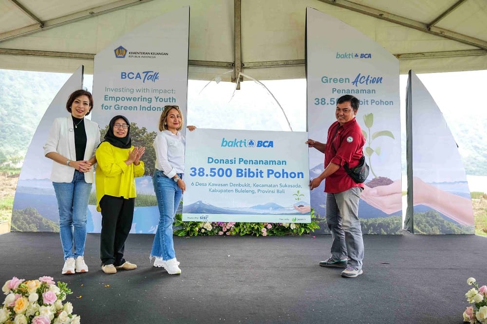 Beri Dampak Positif untuk Lingkungan, BCA Donasi 38.500 Pohon - EVP Corporate Communication PT Bank Central Asia Tbk. (BCA) Hera F. Haryn (kedua kanan) menyerahkan secara simbolis 38.500 bibit kepada Perwakilan Dinas Lingkungan Hidup dan Kehutanan Provinsi Bali I Gusti Ketut Wiguna (kanan), disaksikan oleh Direktur Pembiayaan Syariah DJPPR Kementerian Keuangan Dwi Irianti Hadiningdyah (kedua kiri), di Bali, Kamis (23/11). BCA melalui program CSR Bakti BCA menanam bibit tanaman Multi Purpose Tree Species (MPTS) yang disesuaikan dengan karakteristik hutan di wilayah pedesaan Denbukit, seperti durian, kopi, alpukat, jeruk bali, hingga flora khas Bali majegau. Bibit pohon tersebut ditanam di enam desa kawasan Denbukit, yakni Desa Selat, Desa Wanagiri, Desa Ambengan, Desa Panji, Desa Panji Anom, dan Desa Sambangan. Selain dampak ekologis, jenis-jenis pohon yang ditanam BCA diharapkan dapat memberikan manfaat ekonomi bagi masyarakat sekitar lokasi penanaman pohon.