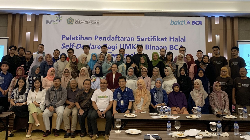 Hadirkan Berkah Bagi UMKM Tasikmalaya, BCA Fasilitasi Sertifikasi Halal Gratis - Kepala BCA KCU Tasikmalaya Hendri Darmin (Tengah) bersama dengan UMKM peserta Workshop Sertifikasi Halal Gratis di Hotel Horison Tasikmalaya, Selasa (28/11). PT Bank Central Asia Tbk (BCA) bersama dengan Kementerian Koperasi dan UKM menggelar workshop sertifikasi halal secara gratis untuk UMKM binaan BCA di Tasikmalaya. Kegiatan ini merupakan bagian dari komitmen BCA untuk terus berkontribusi dalam pemberdayaan UMKM melalui ekonomi halal di Indonesia.