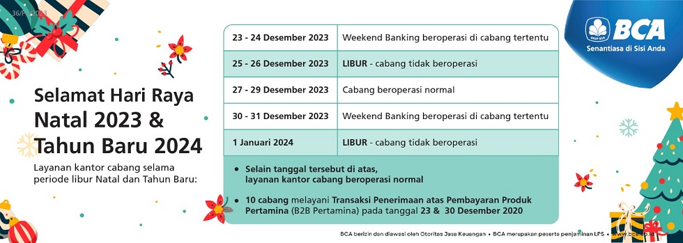 Jakarta, 16 Desember 2023 - PT Bank Central Asia Tbk (BCA) senantiasa berkomitmen untuk menghadirkan service excellence bagi seluruh nasabah tercinta. Selama periode libur Natal 2023 dan Tahun Baru 2024 (Nataru), BCA siap melayani kebutuhan perbankan nasabah melalui berbagai kanal yang dimiliki.