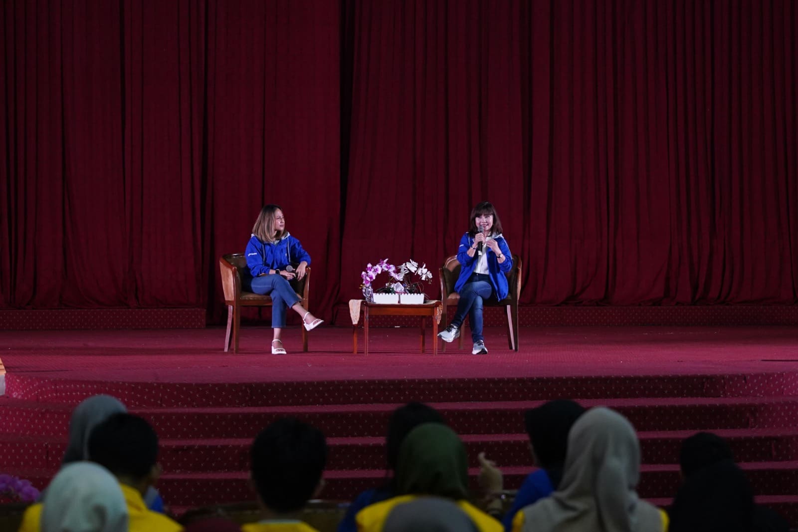 Meraih Peluang dari Ketidakpastian - Direktur BCA Lianawaty Suwono (Kanan) dan EVP Corporate Communication and Social Responsibilities BCA Hera F. Haryn dalam rangkaian kegiatan BCA Berbagi Ilmu di Auditorium Universitas Sriwijaya, Indralaya, Palembang, pada Jumat (17/5). Mengusung tema “Dancing Beautifully with Uncertainties”, Direktur BCA Lianawaty Suwono membahas mengenai cara menghadapi ketidakpastian. Menurutnya, Ketidakpastian dapat diartikan negatif, namun bisa juga berbuah manis dan membuka peluang, tergantung bagaimana cara menghadapinya.