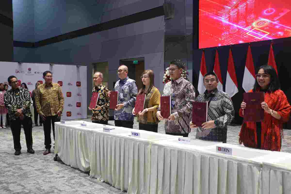 Memperkuat Sinergi Antara Perbankan dengan Pasar Modal - Direktur BCA John Kosasih (ketiga dari kanan) dalam penandatanganan kerja sama antara PT Bank Central Asia Tbk dan 22 bank lain dengan PT Kustodian Sentral Efek Indonesia (KSEI) sebagai Bank Administrator Rekening Dana Nasabah (RDN) dan Bank Pembayaran periode 2024-2029 di Bursa Efek Indonesia, Jumat (19/7). Kerja sama ini menandai penguatan sinergi antara lembaga perbankan dan pasar modal.