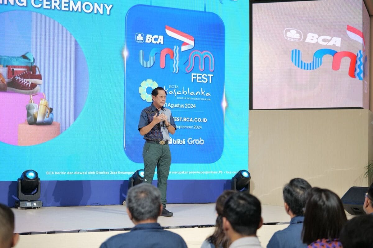 Perluas Akses Pasar UMKM & Pengusaha Lokal Lewat BCA UMKM Fest 2024 - Presiden Direktur BCA Jahja Setiaatmadja saat memberikan sambutan pada seremoni pembukaan BCA UMKM Fest 2024, di Mal Kota Kasablanka, Jakarta, Rabu (7/8). BCA UMKM Fest 2024 merupakan wujud keberpihakan BCA terhadap pelaku usaha mikro, kecil, dan menengah sebagai aktor penting dalam perekonomian Indonesia. Melalui BCA UMKM Fest 2024, BCA menciptakan peluang strategis bagi pelaku usaha memperluas jangkauan pasarnya baik di dalam dan luar negeri.