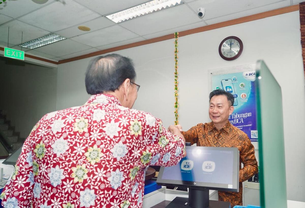 BCA Senantiasa Jaga Kepercayaan Nasabah Melalui Inovasi Berkesinambungan - Presiden Direktur BCA Jahja Setiaatmadja (tengah) saat menyapa salah satu nasabah di KCU BCA Rawamangun pada Rabu (4/9) dalam rangka Hari Pelanggan Nasional 2024. PT Bank Central Asia Tbk (BCA) menegaskan komitmen untuk memberikan pelayanan terbaik bagi seluruh nasabah setia. Mengangkat tema “Your Trust, Our Commitment” pada perayaan tahun ini, BCA berupaya untuk senantiasa menjaga kepercayaan nasabah melalui inovasi berkesinambungan pada platform perbankan transaksi.