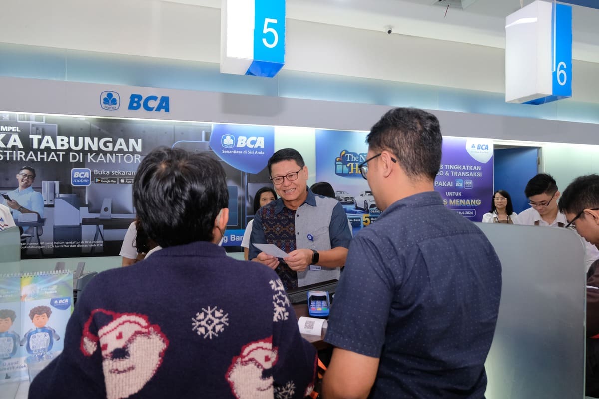 Perayaan Hari Pelanggan Nasional 2024 menjadi semakin meriah dengan kehadiran jajaran Direksi BCA yang secara khusus menyambut dan melayani nasabah secara langsung di enam KCU BCA pada Rabu (4/9). Secara lebih rinci, Presiden Direktur BCA Jahja Setiaatmadja hadir di KCU BCA Rawamangun, Wakil Presiden Direktur BCA Hendra Lembong di KCU BCA Bintaro, Direktur BCA Subur Tan di KCU BCA SCBD, Direktur BCA Frengky Chandra Kusuma di KCU BCA Tanjung Priok, Direktur BCA John Kosasih di KCU BCA Pantai Indah Kapuk (PIK), dan Direktur BCA Antonius Widodo Mulyono di KCU BCA Bumi Serpong Damai (BSD).