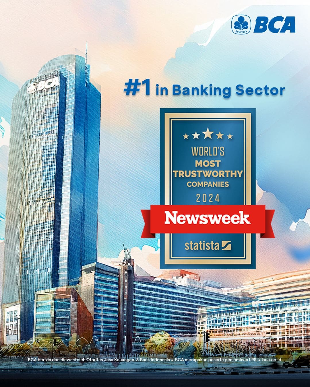 BCA Didapuk Jadi Bank Paling Dipercaya - PT Bank Central Asia Tbk (BCA) kembali meraih predikat bergengsi sebagai World’s Most Trustworthy Company atau perusahaan paling dapat dipercaya di dunia versi Majalah Newsweek. Mewakili Indonesia, BCA menduduki peringkat pertama di dunia untuk kategori Banks selama dua tahun beruntun, mengungguli 66 bank lainnya yang berasal dari berbagai negara.