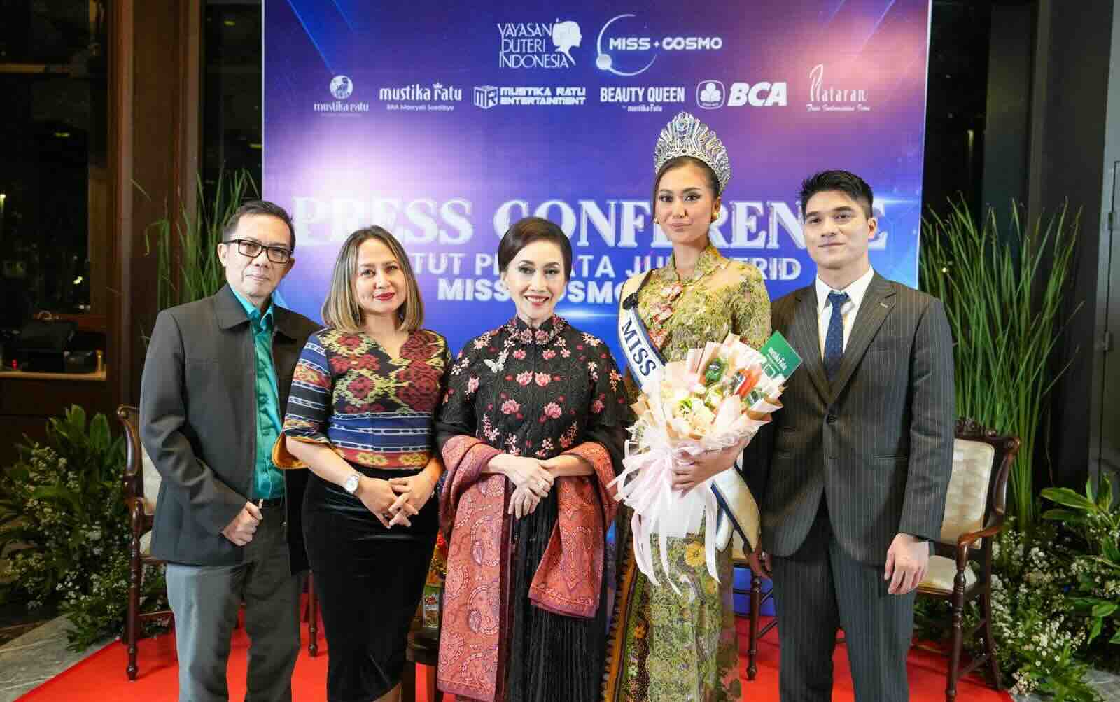 Kolaborasi BCA dengan YPI: Komitmen Dukung Inklusivitas dan Optimalisasi Peran Perempuan di Berbagai Bidang - Ketua Dewan Penasehat Yayasan Puteri Indonesia Putri Kus Wisnu Wardani (tengah), EVP Corporate Communication & Social Responsibility BCA Hera F. Haryn (kedua dari kiri), Direktur Utama PT Mustika Ratu Tbk Bingar Egidius Situmorang (kiri), Puteri Indonesia Pariwisata 2024 dan Miss Cosmo Internasional 2024 Permata Juliastrid (kedua dari kanan), dan President Miss Cosmo Organization Tran Viet Bao Hoang (kanan) dalam Press Conference "Kemenangan Puteri Indonesia Pariwisata 2024 di Ajang Miss Cosmo 2024" di Hutan Kota by Plataran, Senin (25/11). Kolaborasi strategis BCA dan Yayasan Puteri Indonesia menorehkan prestasi bersejarah di ajang internasional. Pemenang Puteri Indonesia Pariwisata 2024 Permata Juliastrid, yang akrab disapa Tata, berhasil menjadi wakil Indonesia pertama yang dinobatkan sebagai Miss Cosmo International 2024.