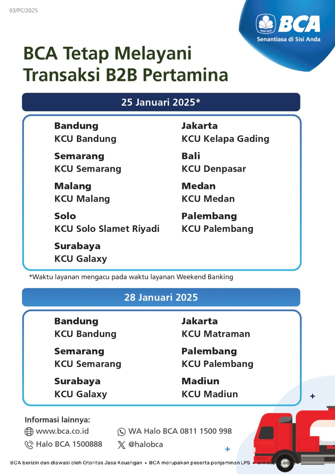 - Pada tanggal 28 Januari 2025, layanan transaksi B2B Pertamina hanya tersedia di cabang – cabang berikut: KCU Bandung (Bandung), KCU Semarang (Semarang), KCU Galaxy (Surabaya), KCU Matraman (Jakarta), KCU Palembang (Palembang), dan KCU Madiun (Madiun).