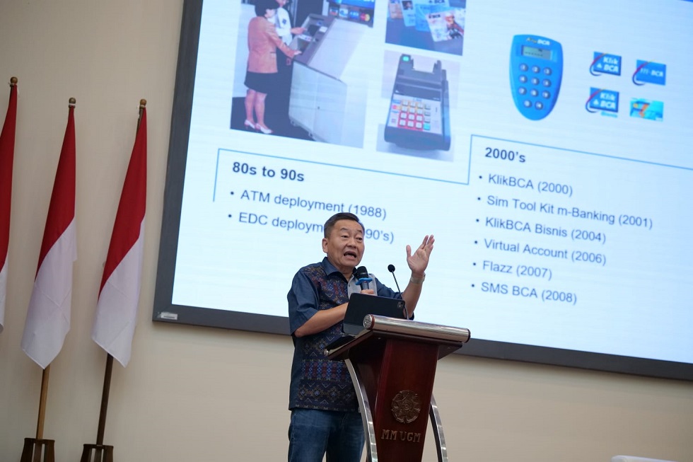BCA Berbagi Ilmu di UGM Bahas Digitalisasi dan Dampaknya bagi Pelaku Bisnis - Direktur BCA Santoso menjelaskan adaptasi yang konsisten dilakukan BCA dari waktu ke waktu, saat menjadi narasumber utama BCA Berbagi Ilmu (BBI) bertajuk ‘Digitalization and its Impact Toward Business,' di Universitas Gadjah Mada, Yogyakarta, Rabu (30/4). BBI di UGM diikuti lebih dari 400 mahasiswa. Kegiatan ini merupakan gelaran ketiga dari rangkaian BBI pada tahun 2025, setelah sebelumnya diselenggarakan di Universitas Brawijaya, Malang (17/3) dan Universitas Indonesia, Depok (21/4).