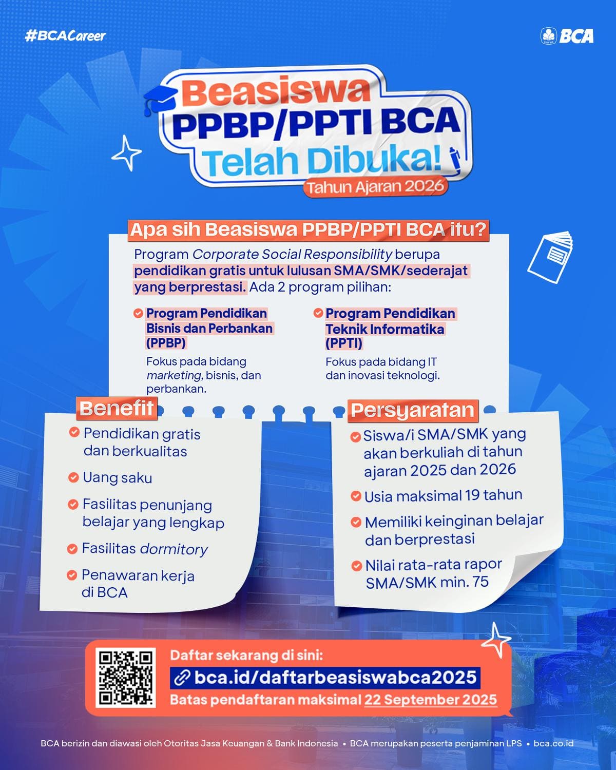 Jakarta, 22 Juli 2025 - PT Bank Central Asia Tbk (BCA) kembali menghadirkan Beasiswa BCA Program Pendidikan Bisnis dan Perbankan (PPBP) serta Program Pendidikan Teknik Informatika (PPTI) untuk tahun ajaran 2026. Beasiswa ini adalah wujud komitmen perseroan meningkatkan akses pendidikan berkualitas, sekaligus mempersiapkan angkatan kerja melalui pembentukan sumber daya manusia yang berdaya saing. Pendaftaran Beasiswa PPBP dan PPTI BCA dibuka sejak 11 April hingga 22 September 2025.