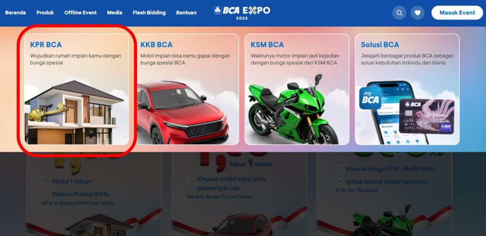 Melalui laman expo.bca.co.id, pengunjung dapat menjelajahi pilihan properti impian, berkonsultasi virtual, dan mengajukan Kredit Pemilikan Rumah (KPR), hingga simulasi KPR berbagai unit properti idaman. Terdapat lebih dari 150 developer, lebih dari 360 proyek, 115 broker, dengan lebih dari 6.700 listing property yang tersebar di berbagai kota. Mengusung semangat #JadiKejadian, BCA Expo 2025 menawarkan suku bunga spesial KPR mulai dari 1,65% eff.p.a. fixed 1 tahun serta diskon provisi hingga 50%.