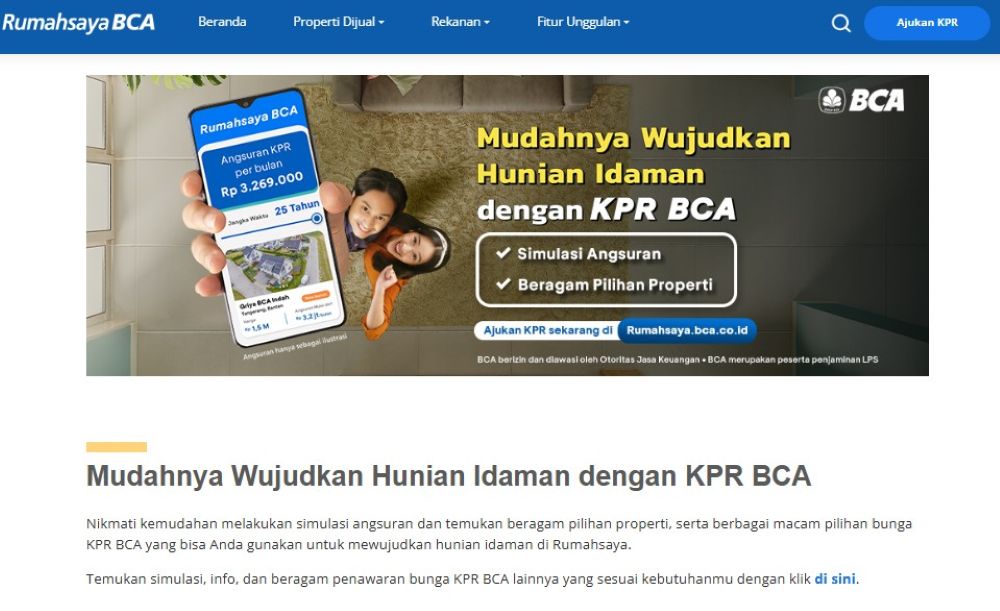 Di beranda website, pilih menu “Produk” lalu klik “KPR BCA”. Di menu ini, Anda bisa menemukan menu daftar properti, produk KPR BCA, simulasi KPR, hingga pengajuan KPR. Untuk melakukan simulasi KPR, nasabah cukup klik “Simulasi KPR” yang dirancang untuk memberikan estimasi angsuran sesuai kebutuhan, kemampuan finansial dan pilihan properti sesuai kehendak Anda.