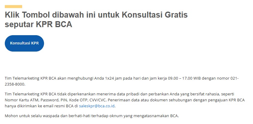 Melalui tombol “Konsultasi KPR”, Anda akan diarahkan ke situs rumahsaya.bca.co.iduntuk berkonsultasi langsung melalui telepon dengan Tim Telemarketing KPR BCA dan mendapatkan rekomendasi terbaik sesuai kebutuhan KPR Anda. Namun, jika Anda lebih nyaman dan praktis berkonsultasi melalui pesan singkat, manfaatkan layanan Konsultasi KPR via WhatsApp Bank BCA yang dapat diakses melalui Widget Halo BCA Chat. Cukup dengan satu klik, Anda bisa langsung terhubung dengan tim kami untuk mendapatkan solusi KPR yang tepat, cepat, dan sesuai kebutuhan Anda.