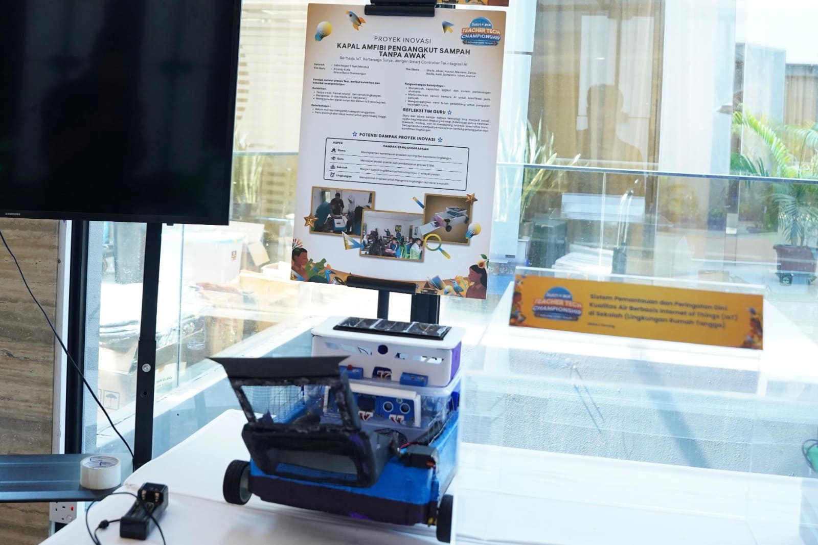 Karya Hebat dari Timur - Inovasi dari pemenang Bakti BCA Teacher Tech Championship. SMAN 2 Kota Sorong (atas) memamerkan Sistem Pemantauan dan Peringatan Dini Kualitas Air Berbasis Internet of Things (IoT). Sementara itu, SMAN 1 Tual (bawah) menampilkan Kapal Amfibi Pengangkut Sampah Tanpa Awak Bertenaga Surya. Kedua karya ini membuktikan potensi inovasi yang lahir dari bimbingan guru dan semangat menghadapi tantangan di wilayah Maluku dan Papua.