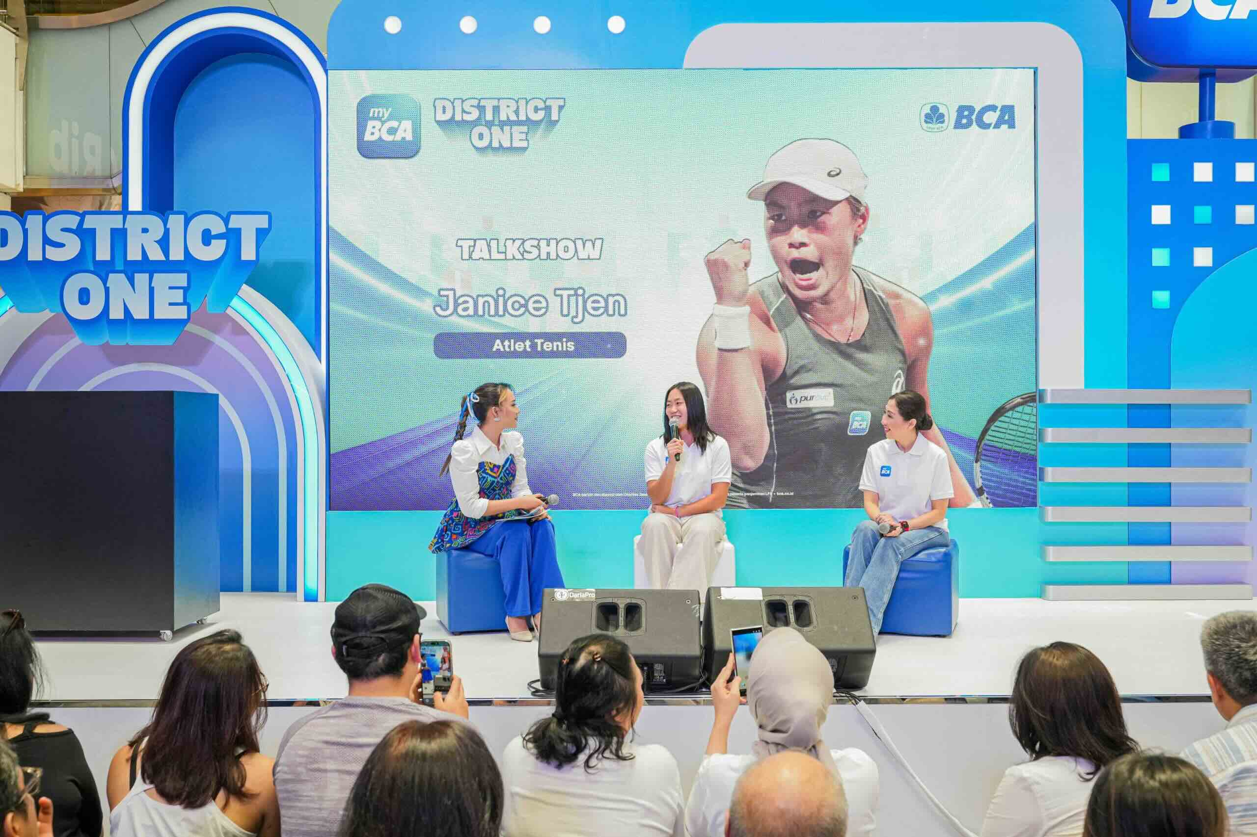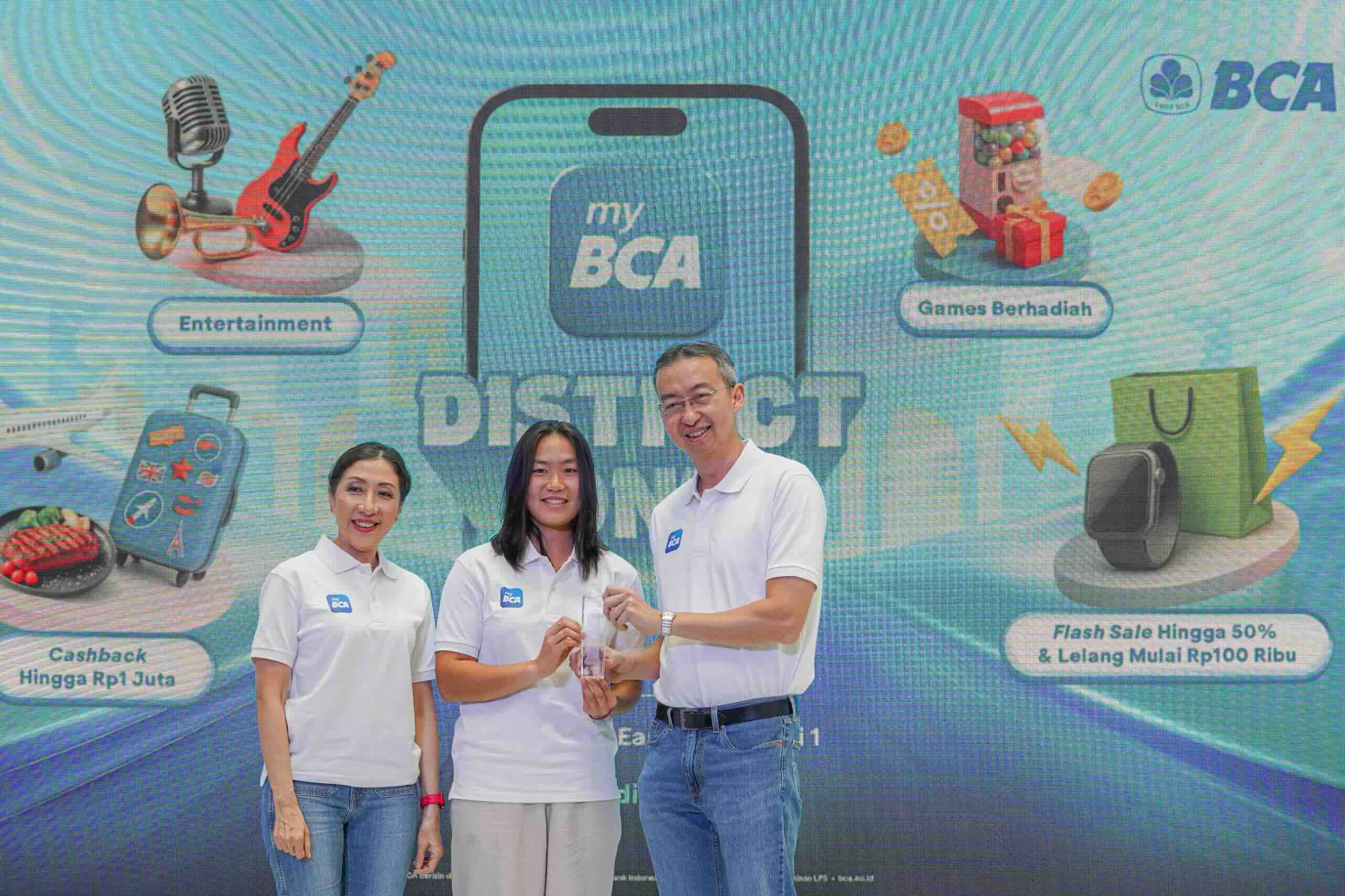 BCA Dampingi Janice Tjen Harumkan Nama Indonesia di Kancah Global - Presiden Direktur BCA Hendra Lembong (paling kanan) bersama Direktur BCA Vera Eve Lim (paling kiri) menyerahkan plakat sebagai wujud apresiasi atas prestasi petenis putri Indonesia Janice Tjen (tengah), dalam acara myBCA talkshow yang diadakan di myBCA District One, Jakarta, Sabtu (15/11). Keselarasan nilai antara BCA dan Janice menjadi salah satu alasan BCA memberikan dukungan kepada atlet muda tersebut. Konsistensi dan kerja keras Janice sejalan dengan nilai-nilai yang senantiasa dijunjung BCA dalam memberikan layanan terbaik bagi masyarakat dan nasabah.