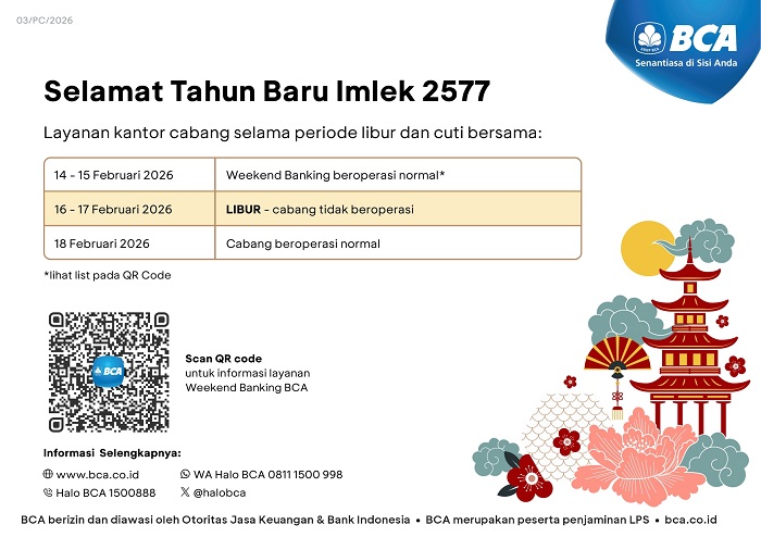 Berikut detail penyesuaian operasional kantor cabang BCA selama libur dan cuti bersama Tahun Baru Imlek 2026: