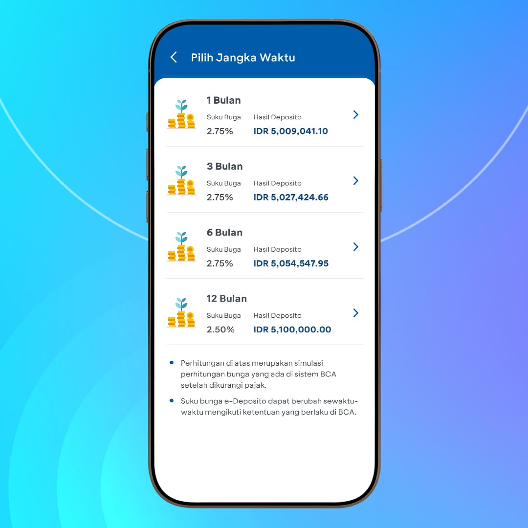 - Fleksibel. Jangka waktunya bisa dipilih sendiri, bisa 1, 3, 6, atau 12 bulan. Selain itu, bisa juga memilih metode perpanjangan. Kalau dana pokoknya saja diperpanjang otomatis dengan jangka waktu yang sama, dan bunganya ditransfer ke rekening kamu, namanya e-Deposito ARO. Kalau nilai pokok serta bunganya didepositokan kembali itu namanya e-Deposito ARO Plus.