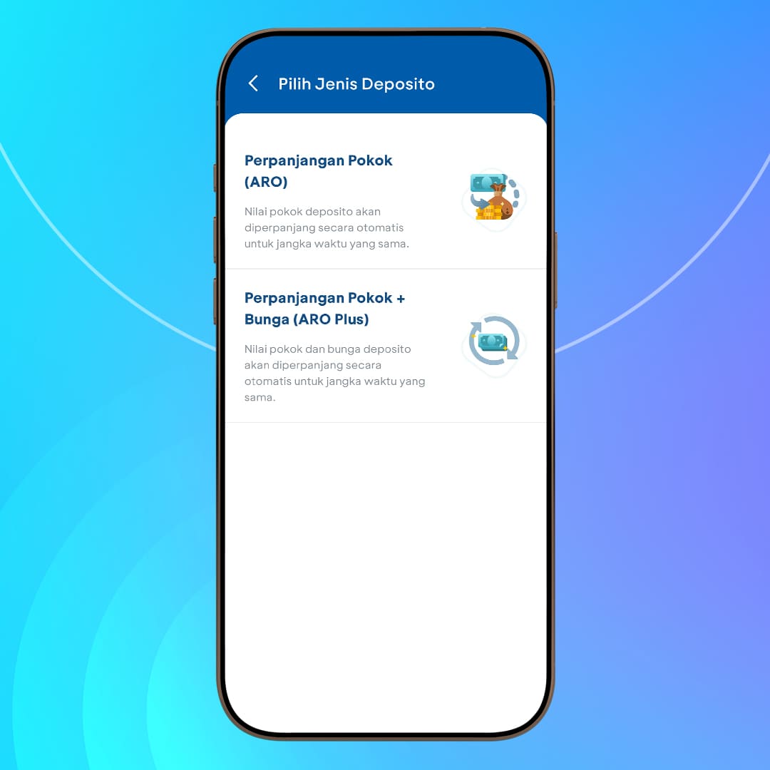 - Pilih jenis e-Depositonya: Perpanjang Pokok (ARO) saja atau Perpanjang Pokok plus bunga (ARO Plus)