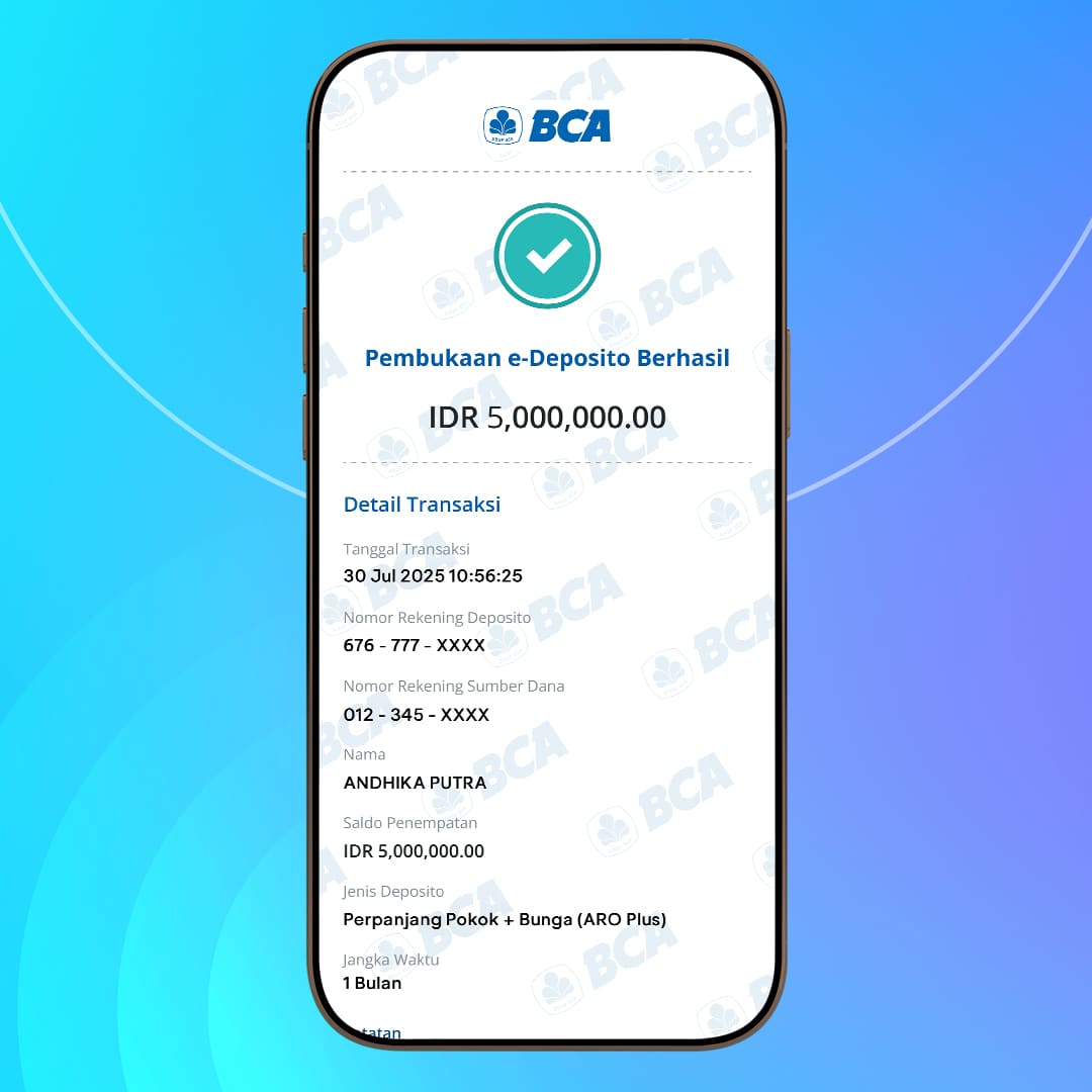 - Praktis karena buka deposito bisa di fitur Deposito dari Digital Platform myBCA. Jadi, kamu tidak perlu khawatir jika bilyet Deposito hilang, karena e-Deposito tanpa bilyet. Paperless.